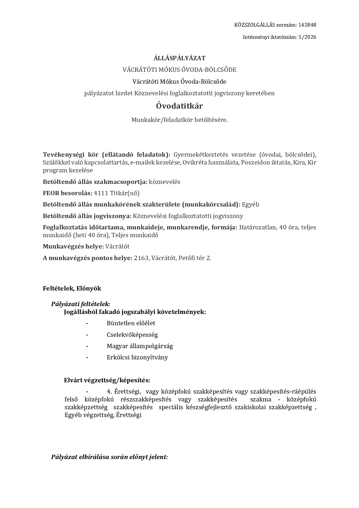 Vácrátót Község Önkormányzat Polgármestere, a helyi önkormányzatokról szóló 2011. évi CLXXXIX. törvény 45. §., valamint Vácrátót Község Önkormányzat Képviselő-testülete által...